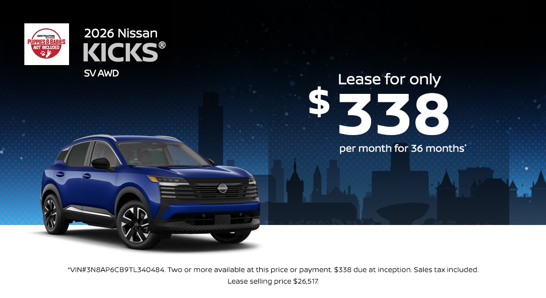 *2026 Nissan Kicks SV AWD. MSRP $28,525. Selling price $26,517. 36 mos. 30,000 mile lease. $0.25 per mile over. $338 Plus tax & DMV fees due at inception. $695 Acquisition Fee & $175 Dealer Doc Fee included in Payment Structure. 730+ FICO score. Offer expires 4/30/2026.